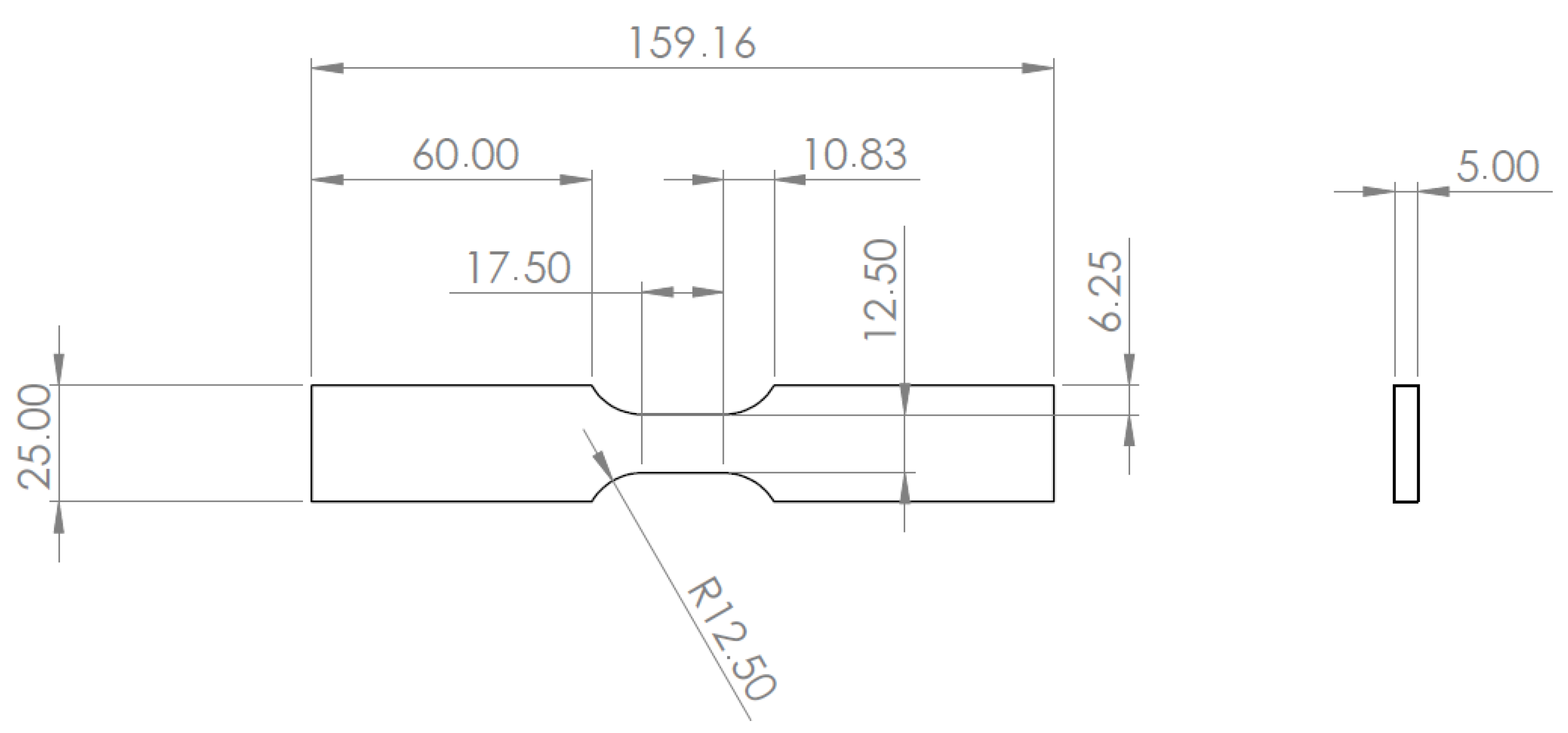 Figure 6. Dog-bone tensile specimen draft, designed following ASTM E606 dimensions.