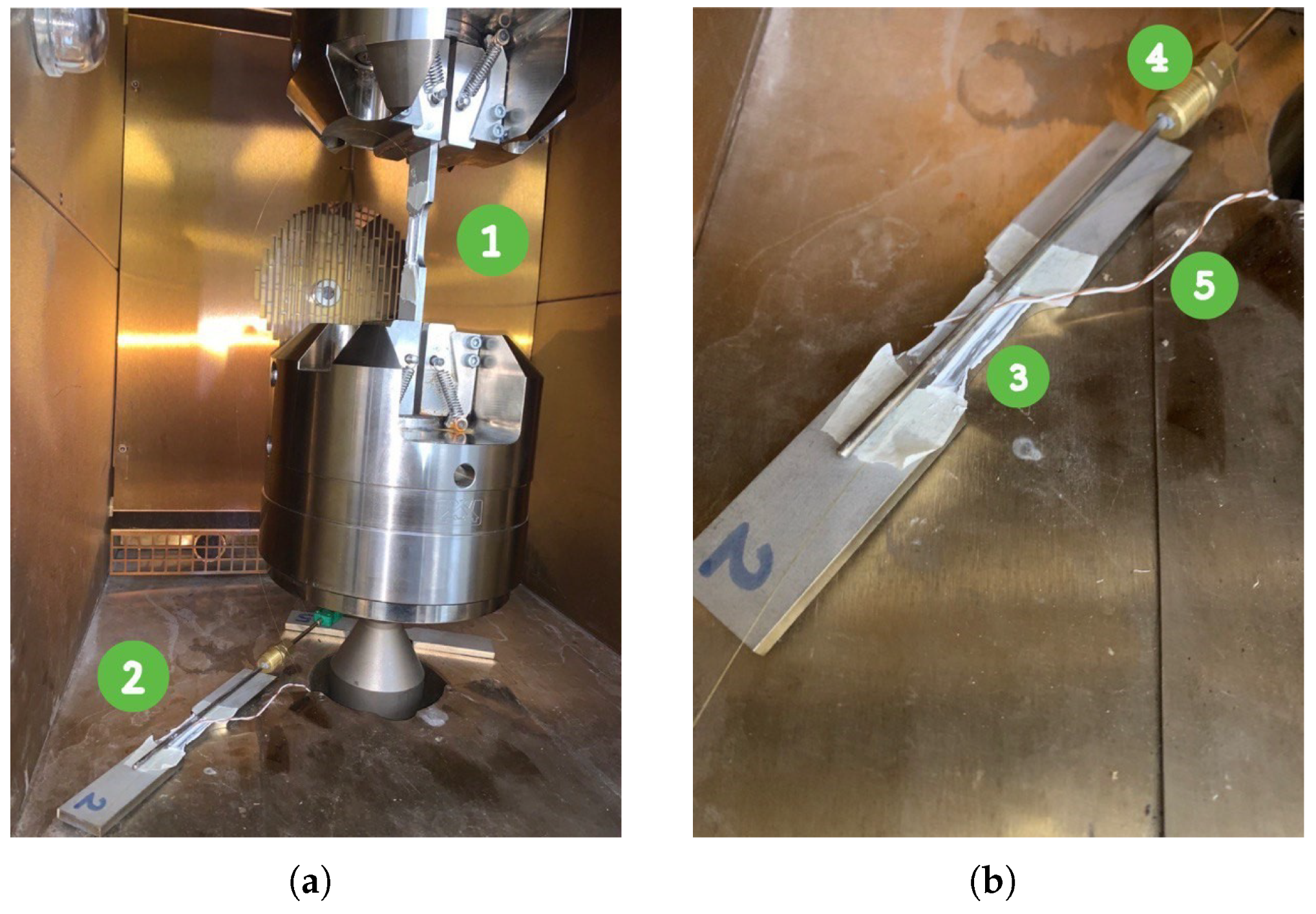 Figure 7. Experimental setup for the thermo-mechanical tests: (a) General view inside the Instron chamber: (1) Specimen 1, subjected to combined tensile loading and thermal cycling, equipped with FBG4 for the first test and with FBG1 for the second; (2) Specimen 2, used as a reference to monitor temperature-only response and equipped with FBG2 throughout all tests. (b) Zoomed view of Specimen 2: (3) FBG2, (4) the K-type thermocouple, and (5) the T-type thermocouple.