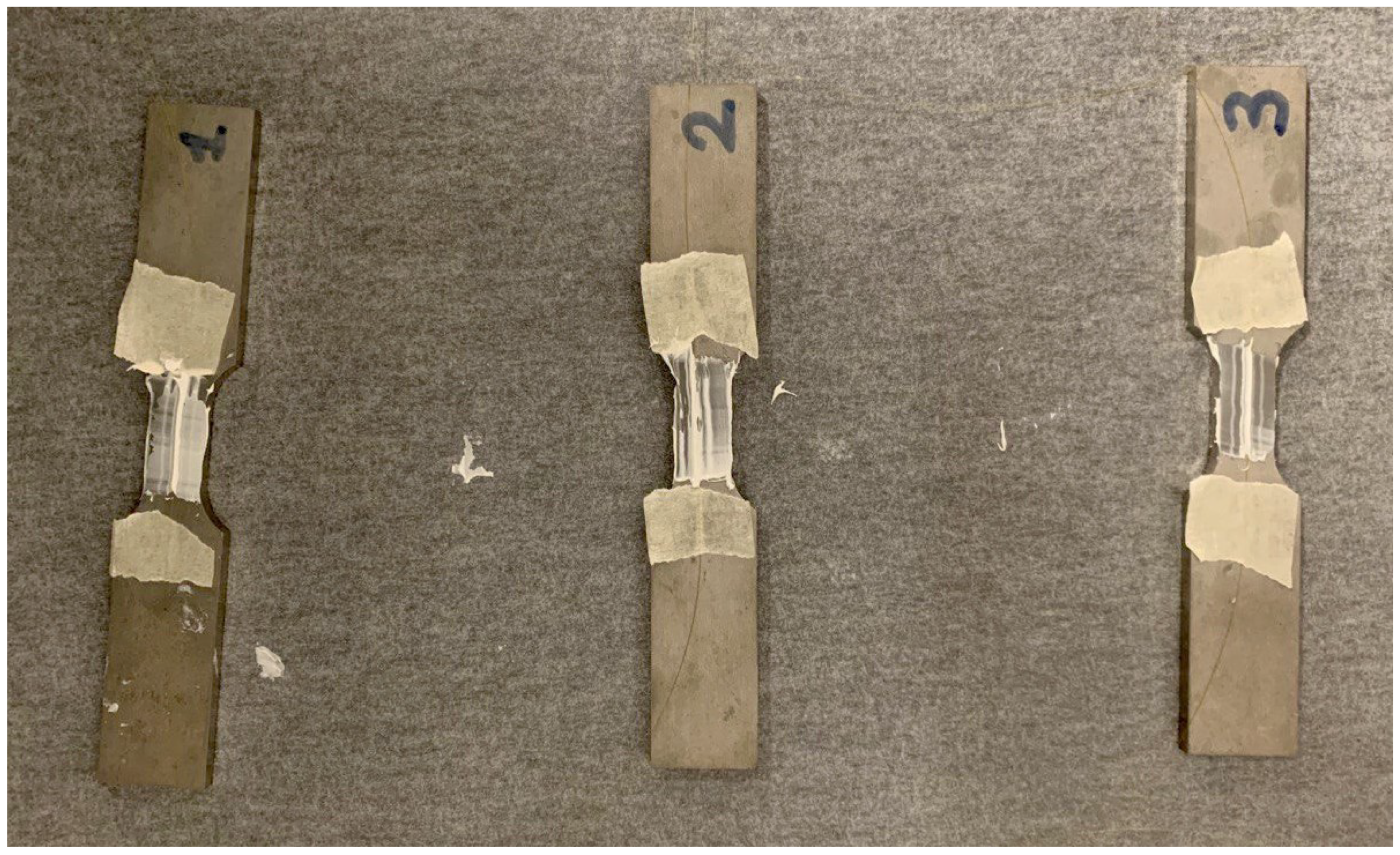 Figure 8. Resin (WEICON Ceramico W) application onto the tensile specimens, with the optical fibers fixed in position using paper tape. A fine applicator was used to deposit a uniform layer (0.1–0.2 mm) along the fiber, minimizing stress concentrations and avoiding damage. The resin was cured for 24 h before testing. The FBGs are positioned at the center of the resin-coated area for accurate wavelength measurements. From left to right, the bonded FBGs are FBG4, FBG2, and FBG1.