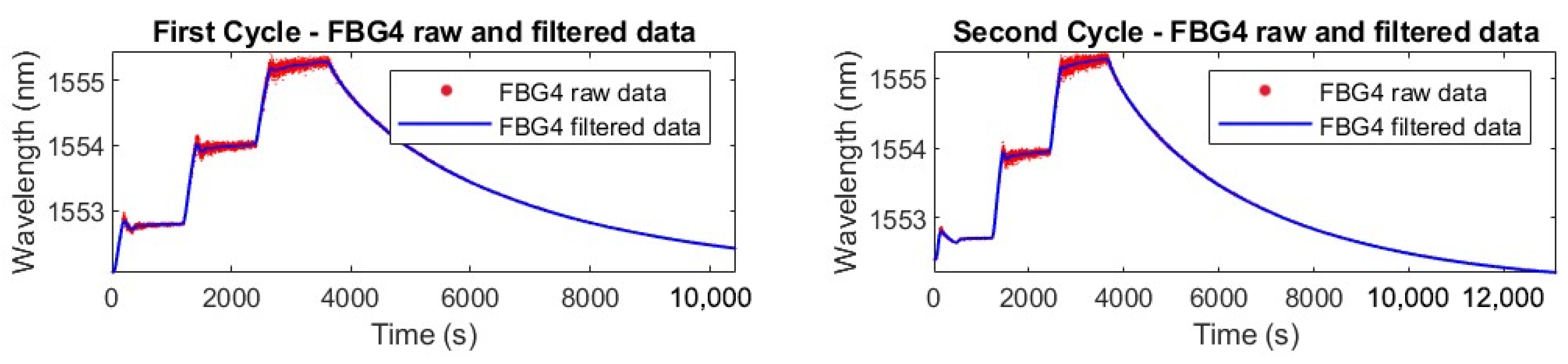 Figure 10. Filtered response of FBG4 during thermal cycling. The left figure corresponds to the first heating–cooling cycle, while the right one corresponds to the second cycle. In both cases, the plots show the raw FBG data acquired from the interrogator (red) and the corresponding signal after applying a Moving Average Filter (blue), for noise reduction and improved signal clarity.