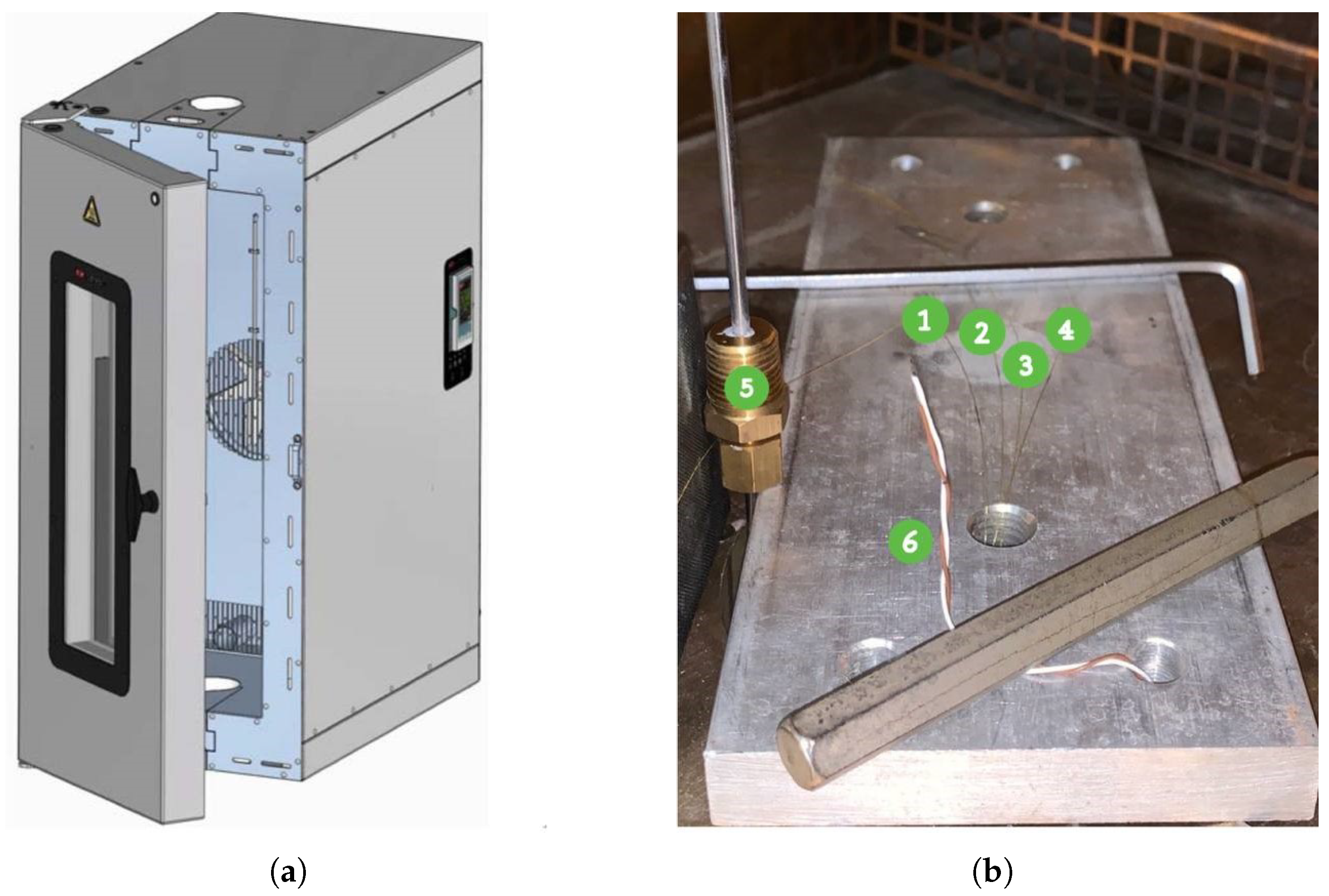 Figure 11. (a) 3119-607 Temperature-Controlled Instron Chamber. (b) Setup of the optical fibers displaced on a neutral platform, to be inserted inside the Instron chamber: (1) FBG1, (2) FBG2, (3) FBG3, (4) FBG4, (5) K-type thermocouple, (6) T-type thermocouple.