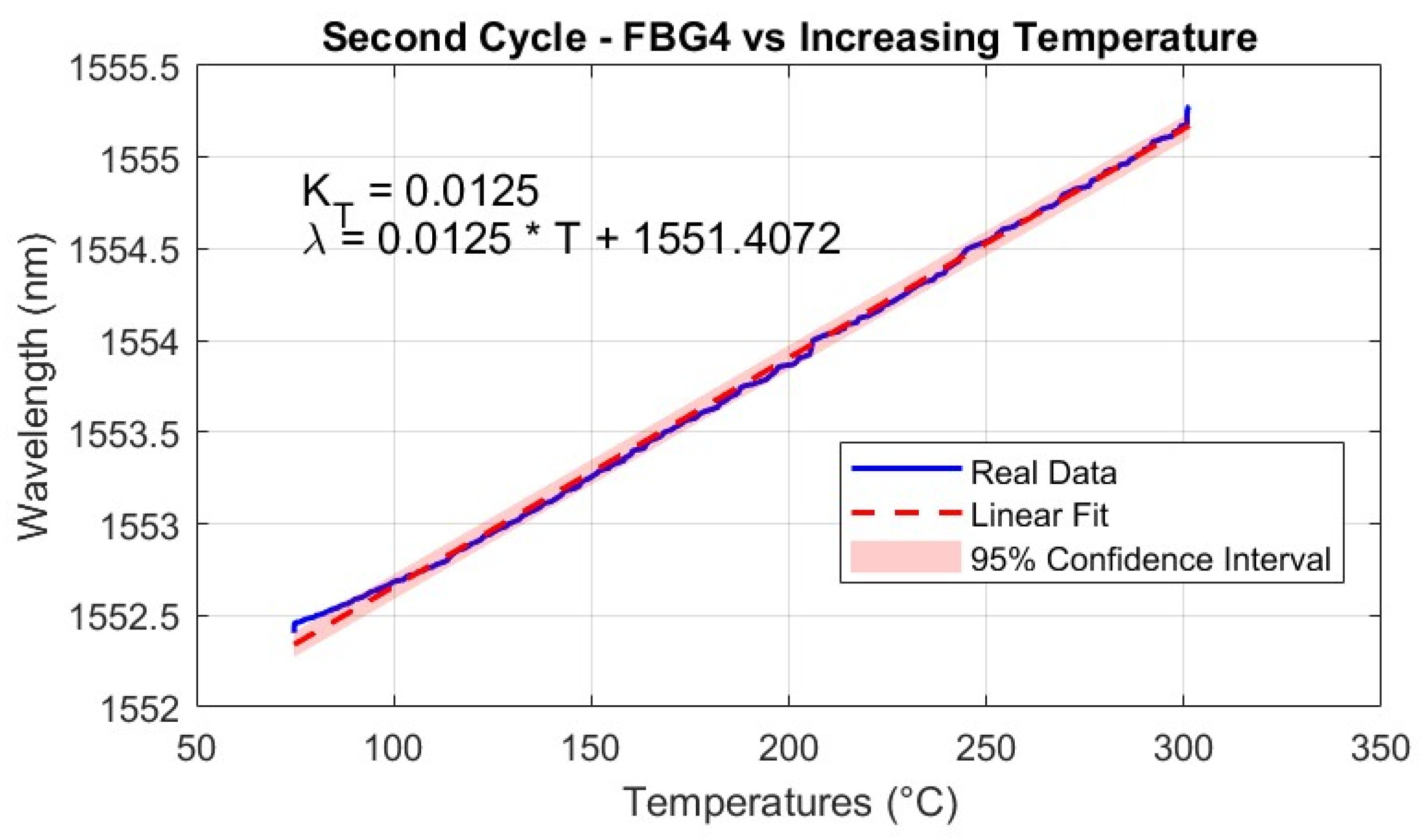 Figure 12. Linear regression of the wavelength shift of FBG4 as a function of temperature during the second heating cycle. The red dashed line represents the linear fit, while the blue line shows the measured wavelength shift data, with the shaded region indicating the 95% confidence interval. Small deviations in the data around 100, 200, and 300 °C correspond to stabilization steps, where the temperature was held constant to ensure thermal equilibrium before continuing the heating ramp.