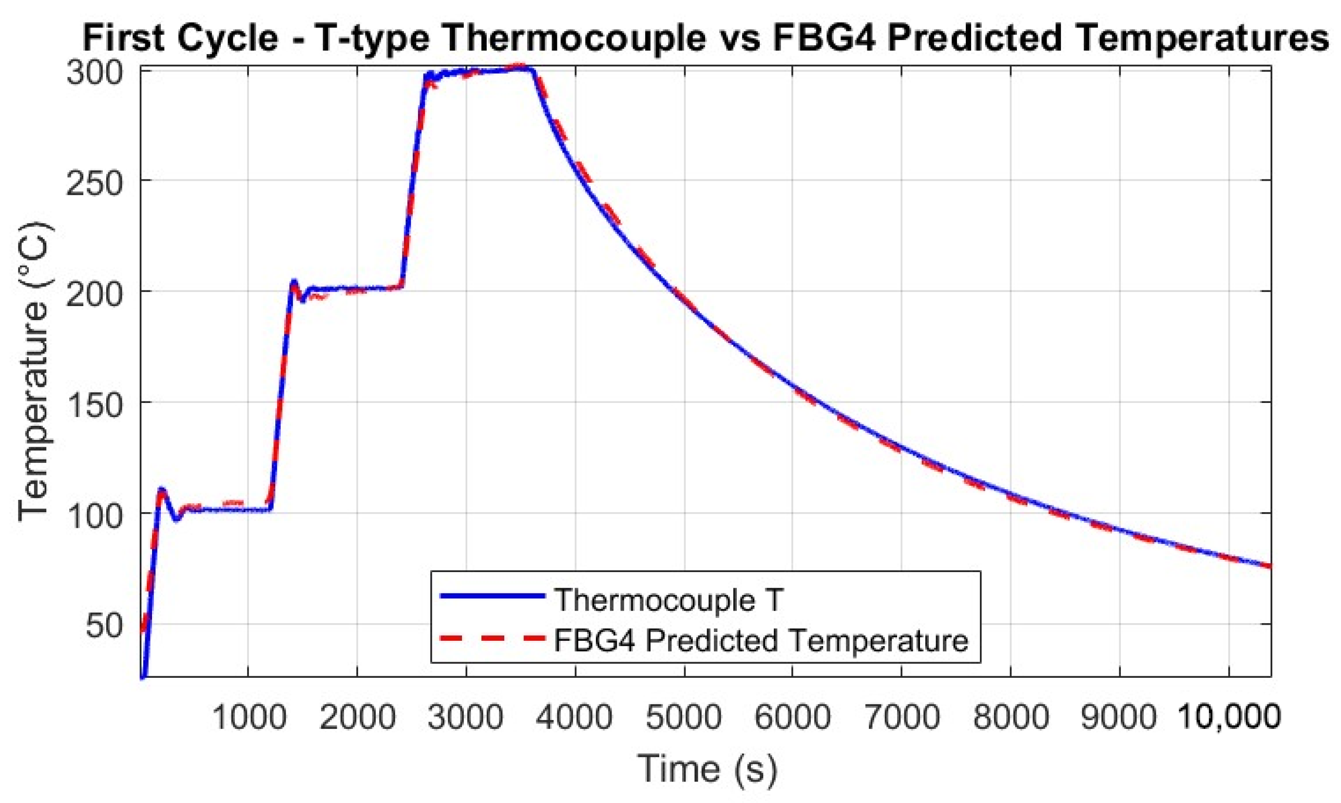 Figure 13. Predicted temperatures from FBG4 (red dashed line) compared to T-type thermocouple measurements (blue solid line) during the first thermal cycle. The figure illustrates the accuracy of the FBG calibration process in capturing temperature-induced wavelength shifts, with minor deviations due to fiber placement and small vibrations in the thermal chamber.