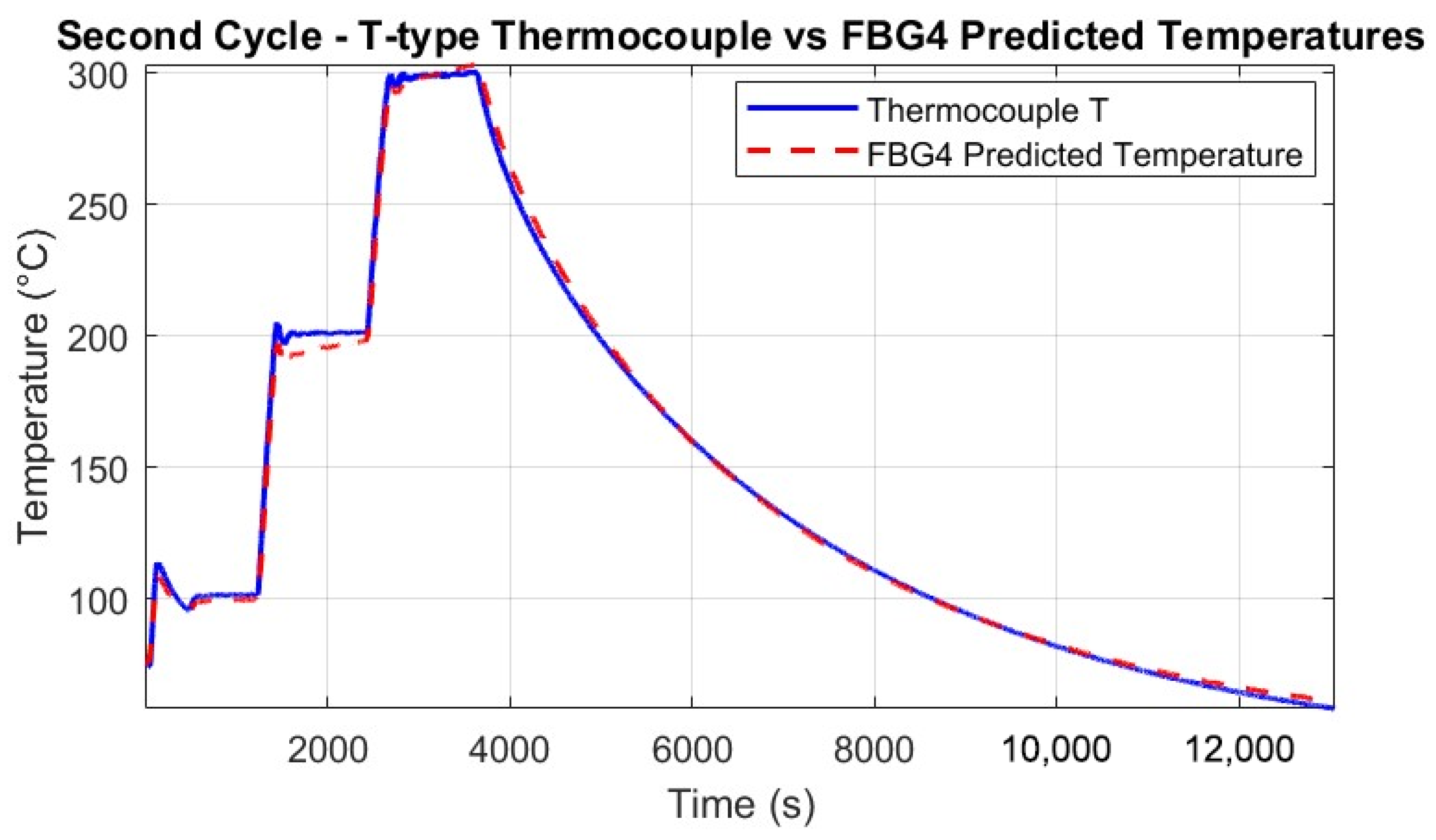 Figure 14. Predicted temperatures from FBG4 (red dashed line) compared to T-type thermocouple measurements (blue solid line) during the second thermal cycle. The figure confirms the repeatability of the FBG response and the reliability of the calibration procedure, with small discrepancies caused by slight differences in sensor positioning and thermal chamber disturbances.