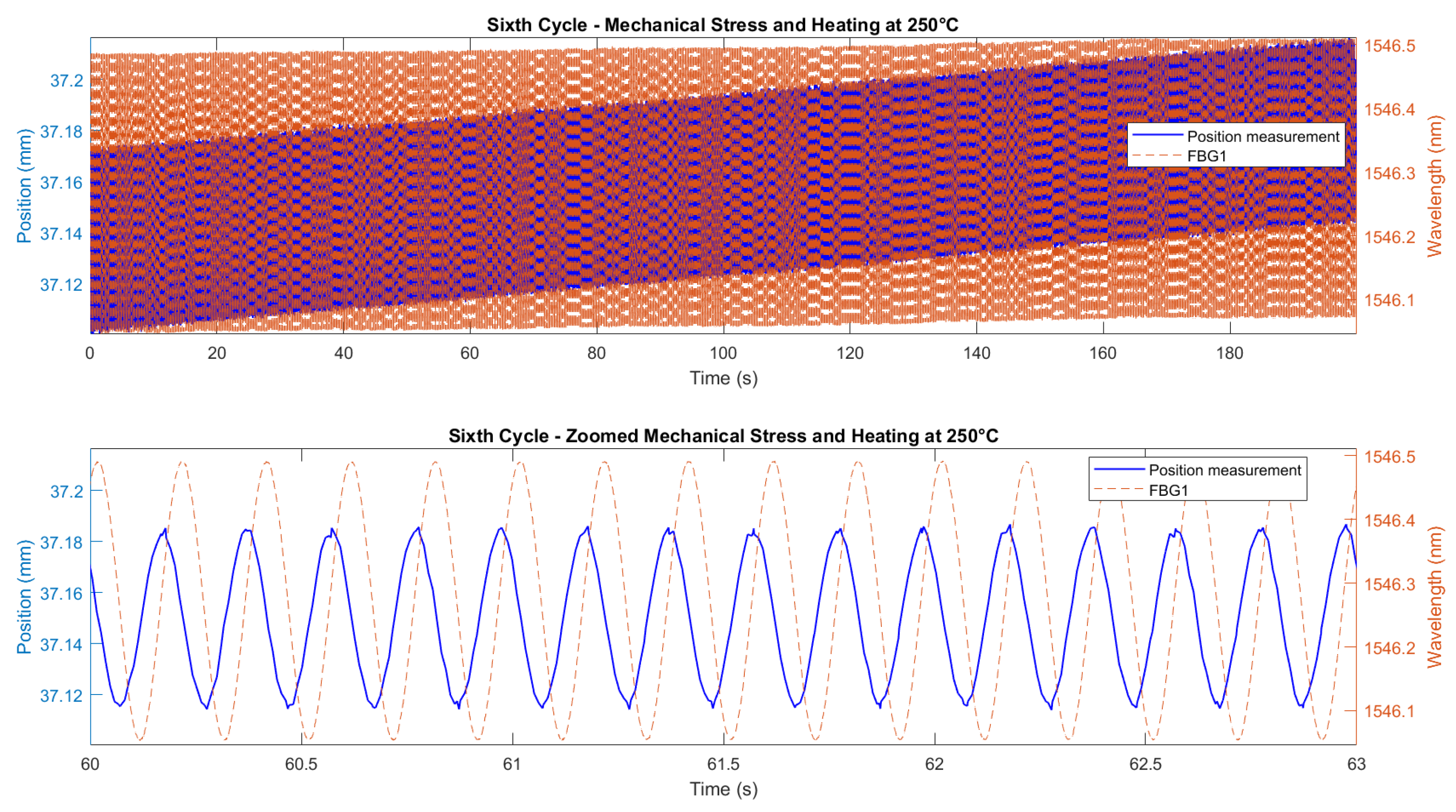 Figure 15. Correlation between FBG1 wavelength shift and Instron crosshead displacement during the fifth cycle of the second test (temperature ramp 200–250 °C, cyclic loading 1 Hz). Top panel shows the full cycle; bottom panel shows a zoomed interval. Blue solid line (left blue axis): Instron crosshead displacement. Orange dashed line (right orange axis): FBG wavelength shift (contains both temperature and stress contributions). A near-constant 20–30 ms time offset between the signals is observed, likely due to the viscoelastic response of the embedding resin and small synchronization differences between acquisition systems.