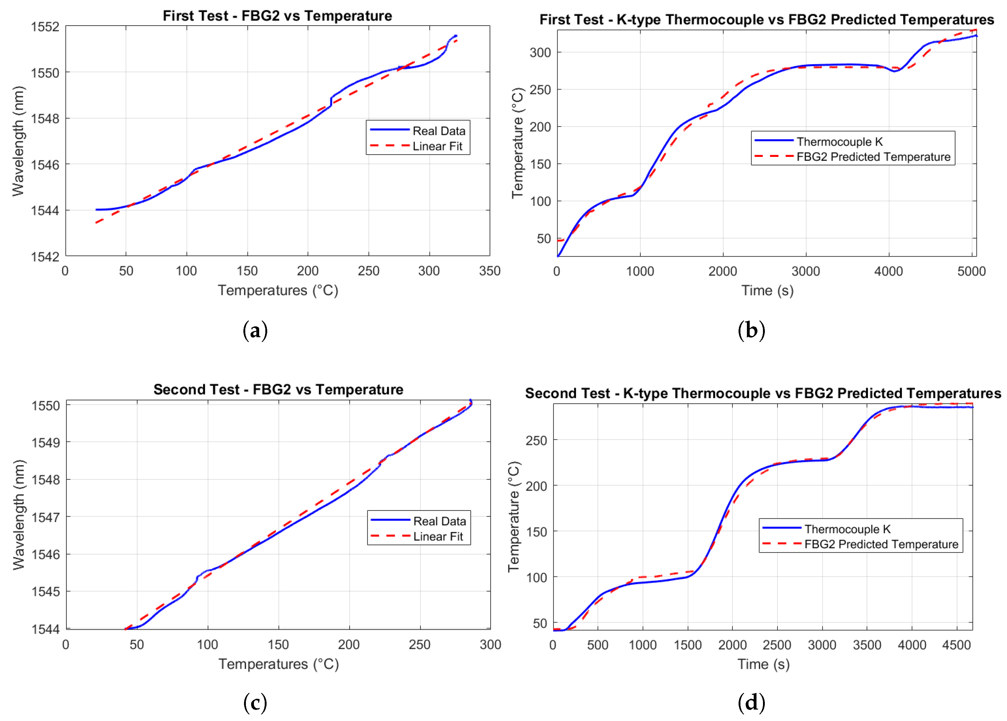 Figure 17. Thermal calibration of FBG2. (a) Correlation between temperature and Bragg wavelength shift during the first calibration test, with experimental data (blue line) and linear regression fit (red dashed line). (b) Temperature values predicted from FBG2 during the first test (red dashed line) compared to reference measurements from a K-type thermocouple (blue line). (c) Correlation between temperature and Bragg wavelength shift during the second calibration test, again showing raw data (blue line) and linear fit (red dashed line). (d) Predicted temperatures obtained from FBG2 during the second test (red dashed line) and comparison to the K-type thermocouple measurements (blue line).