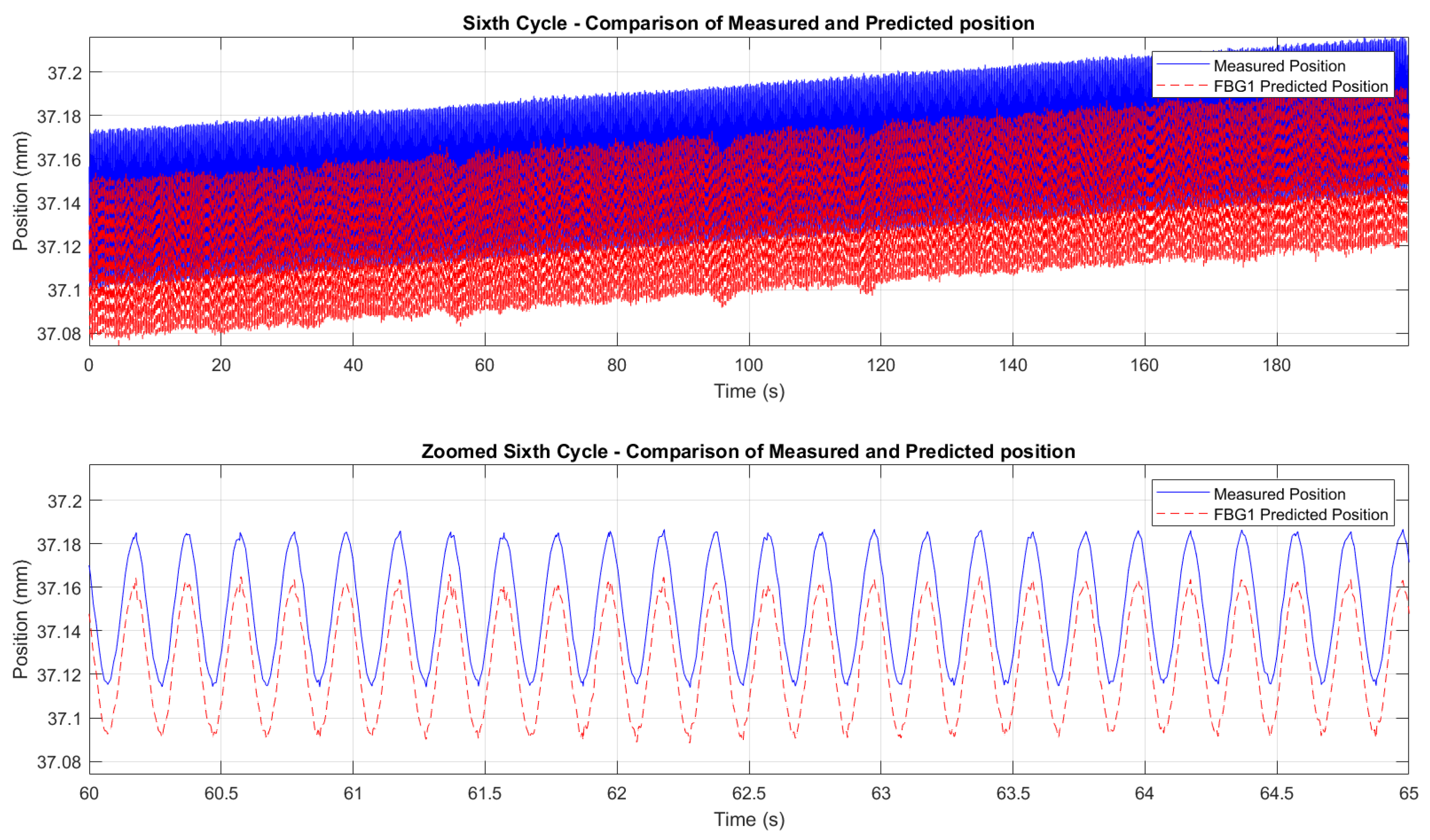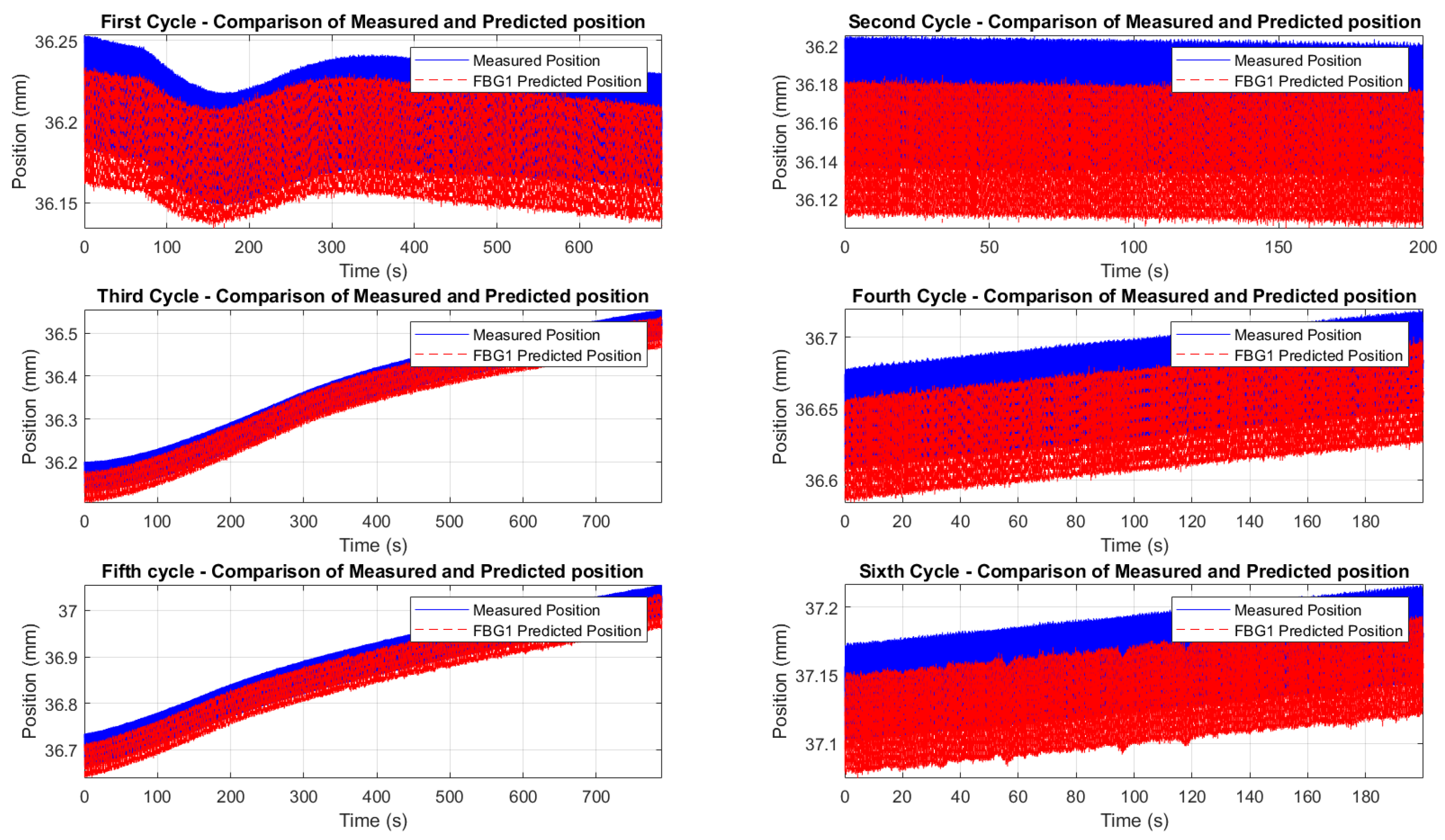 Figure 18. Comparison between measured displacement (blue solid line) and FBG-predicted displacement (red dashed line) during the second thermo-mechanical test. Each subplot represents one of the six consecutive loading–unloading cycles, arranged sequentially from top left to bottom right. The reference sensor (FBG2) was used to compensate for temperature-induced strain shifts, enabling an effective isolation of the displacement signal. Predicted displacements consistently undershoot the Instron crosshead values by a near-constant amount; this downward bias is primarily attributed to a calibration/intercept offset and partial strain transfer through the adhesive layer.