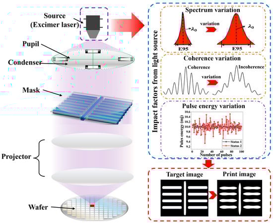 Within lithographic scanner systems, the DUV light source—typically an ArF excimer laser—plays a significant role in determining image contrast and critical dimension (CD). Acting as the optical propagation origin, the source system delivers laser beams with sufficient energy and stable spectral characteristics to meet the stringent requirements of modern lithography. ArF excimer lasers (λ = 193 nm), the predominant DUV source, are characterized by narrow spectral linewidths (mainstream E95 ≈ 0.3 pm), high peak powers (typically 60–90 W), and short pulse widths [4,5,6,7]. Compared with extreme-ultraviolet (EUV) lithography, which has a complex process for generating high-energy photons, the DUV platform has a higher level of system maturity. Nevertheless, as the industry moves toward higher numerical apertures (e.g., 1.35 NA immersion systems) and tighter overlay budgets, imaging performance becomes markedly more sensitive to fluctuations in source parameters. Dynamic instabilities—including bandwidth fluctuation, center wavelength drift, and pulse energy variation—can propagate through the complex optical path system to the focal plane, inducing non-uniform exposure dose distribution that manifests as CD errors, pattern shift, etc., causing the lithography results to deviate from the expectation [8,9,10].