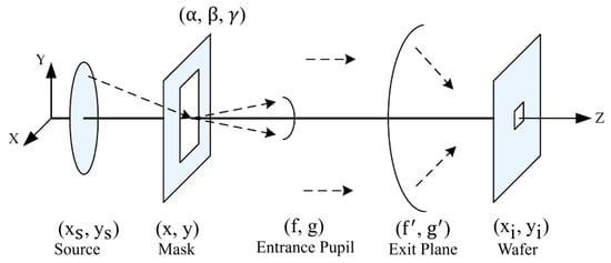 As illustrated in Figure 2, planar waves emitted from the excimer light source irradiate the photomask. These waves undergo diffraction by mask patterns, generating multiple planar wavefronts that propagate in distinct directions. Diffracted orders captured within the numerical aperture (NA) enter the projection lens via the entrance pupil. After transmission through the projection optics to the exit pupil, these diffraction orders generate planar waves that propagate to the image plane, where they interfere to form the aerial image. Under partially coherent illumination, the effective source can be decomposed into an ensemble of spatially incoherent point sources. No interference occurs between wavefronts generated by distinct point sources. Following the principle of partial coherence integration, the total image plane intensity distribution is obtained by computing the intensity contributions from each point source and summing them [27,28,29]:
