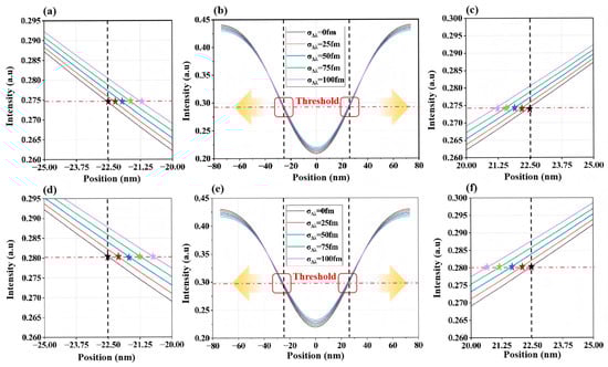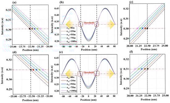 Two-dimensional aerial image intensity variations induced by spectral bandwidth fluctuations for L/S structures with CD = 45 nm and Pitch = 150 nm. (a–c): Δλ = 200 fm, (d–f): Δλ = 300 fm. The black dashed lines denote the two ends of the line structures on the mask pattern, while the red dashed lines indicate the intensity threshold corresponding to a printed linewidth of 45 nm after exposure. The transparent yellow arrows point to the magnified regions marked by the red rectangles in panels (b) or (e), which are shown in panels (a), (c), or (d), (f), respectively. In panels (a), (c), or (d), (f), the star symbols in different colors indicate the actual positions of the two ends of the line structures at the intensity threshold.