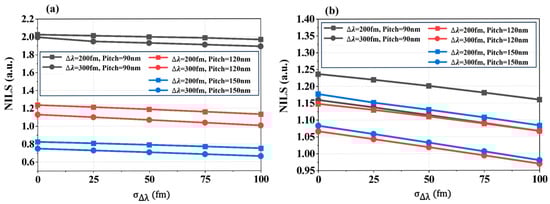NILS variations caused by spectral bandwidth fluctuations. (a) NILS for L/S patterns at dense (90 nm), semi-dense (120 nm), and sparse (150 nm) Pitches; (b) NILS for T2L patterns at dense (90 nm), semi-dense (120 nm), and sparse (150 nm) Pitches.