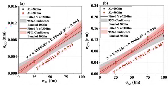 From a large set of simulations, we obtained distributions of the simulated aerial-image critical dimension (AI-CD) and characterized these distributions by normal statistics (μ, σ). Figure 6 shows representative AI-CD distributions for both test patterns under Δλ = 300 fm and = 100 fm. For sparse line structures (Pitch = 150 nm), CD fluctuations () caused by spectral instabilities significantly exceed those in dense/semi-dense patterns. Figure 7 plots the relationship between and for dense patterns (Pitch = 90 nm) with linear fitting. It reveals that worsening bandwidth stability increases CD variations in both L/S and T2L structures, with an approximately linear relationship ∝ . At the dense Pitch (Pitch = 90 nm), 2D patterns ( = 0.13 nm) exhibit greater sensitivity than 1D lines ( = 0.0094 nm). Comparing Figure 6a,b, L/S structures show larger CD variation amplification (: 0.0094 → 0.40 nm) than T2L structures (: 0.13 → 0.28 nm) when transitioning from dense (Pitch = 90 nm) to sparse (Pitch = 150 nm) patterns. This indicates that pattern topology and density substantially change the lithographic performance sensitivity to spectral stability fluctuations.