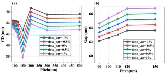 Fluctuations in single-pulse energy during exposure alter the dose delivered to the resist, affecting pattern linewidth (ADI-CD). Figure 8 illustrates ADI-CD variations under dose changes for L/S and T2L mask structures. As shown in Figure 8a, without applying OPC, pulse energy fluctuations are affected by the pattern structure: ADI-CD variations in dense structures (Pitch < 110 nm) are significantly smaller than in sparse patterns. For a 45 nm linewidth with Pitch = 150 nm, a 0.5% pulse energy change induces ~1 nm ADI-CD shift. For 2D T2L structures in the Pitch < 150 nm range, Gap variations (Figure 8b) remain consistent (~0.7 nm) under pulse energy changes.
