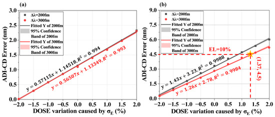 To quantify the contribution of pulse energy stability to CD error, we fitted the simulated data with linear regressions and obtained excellent fits (R2 ≈ 0.99), as plotted in Figure 9. The results show an approximately linear dependence of ADI-CD on pulse energy variation. Under the simulated conditions, the CD error for L/S patterns driven by pulse energy fluctuations remains below 3 nm. For T2L patterns, the CD error induced by pulse energy instability can exceed 5 nm, thereby breaching typical exposure latitude (EL) specifications (i.e., <10% exposure latitude for the advanced node). To satisfy multi-pattern (1D/2D) requirements, pulse energy fluctuations should be maintained below 1%. Comparing the CD error trends for baseline bandwidths of 200 fm and 300 fm in Figure 9, this effect is principally attributable to coherence changes. As discussed in Section 2.2.2, temporal coherence is inversely related to bandwidth—narrower bandwidth yields stronger temporal coherence and more pronounced speckle. Equations (14)–(16) reveal that temporal degree of freedom M ∝ Δλ; higher M diminishes field strength fluctuations, reducing CD errors. Therefore, increasing bandwidth during laser design mitigates coherence-related lithographic effects.
