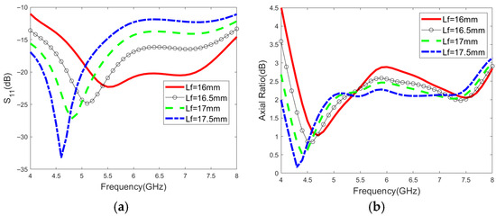 The impact of the significant parameters on the matching performance and circular polarization characteristics is shown in detail in Figure 4. In the case of the single-port excitation mode, the circular polarization characteristics are excited by the interaction between two microstrips and the slotted ground plane, while shortening the length of the microstrip can broaden the impedance bandwidth. Therefore, the length of the microstrip and the sizes of the slots are important parameters for adjusting the matching performance and circular polarization characteristics. As shown in Figure 4a–d, the S11 parameter changes significantly with the adjustment of the Lf and r1 values. As illustrated in Figure 4e–h, the variation trend of the axial ratio across the entire frequency band becomes more pronounced with the increase in r2 and r3.