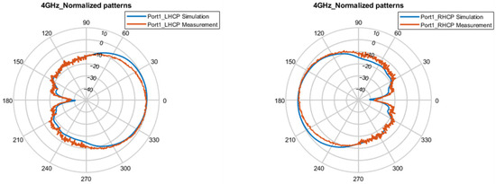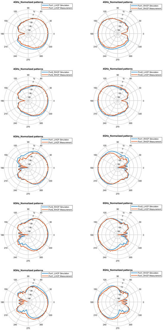 Figure 7 and Figure 8, respectively, present the simulated and measured normalized patterns of the E-plane and H-plane at 4 GHz, 6 GHz, and 8 GHZ under single-port feed conditions. The proposed antenna achieves LHCP in the +z direction and RHCP in the −z direction for port 1 excitation, which is exactly the opposite of the situation when only port 2 is fed. The measured results show that the pattern characteristics are stable and basically consistent with the simulation results, with no obvious distortion in the range of 4–8 GHz.