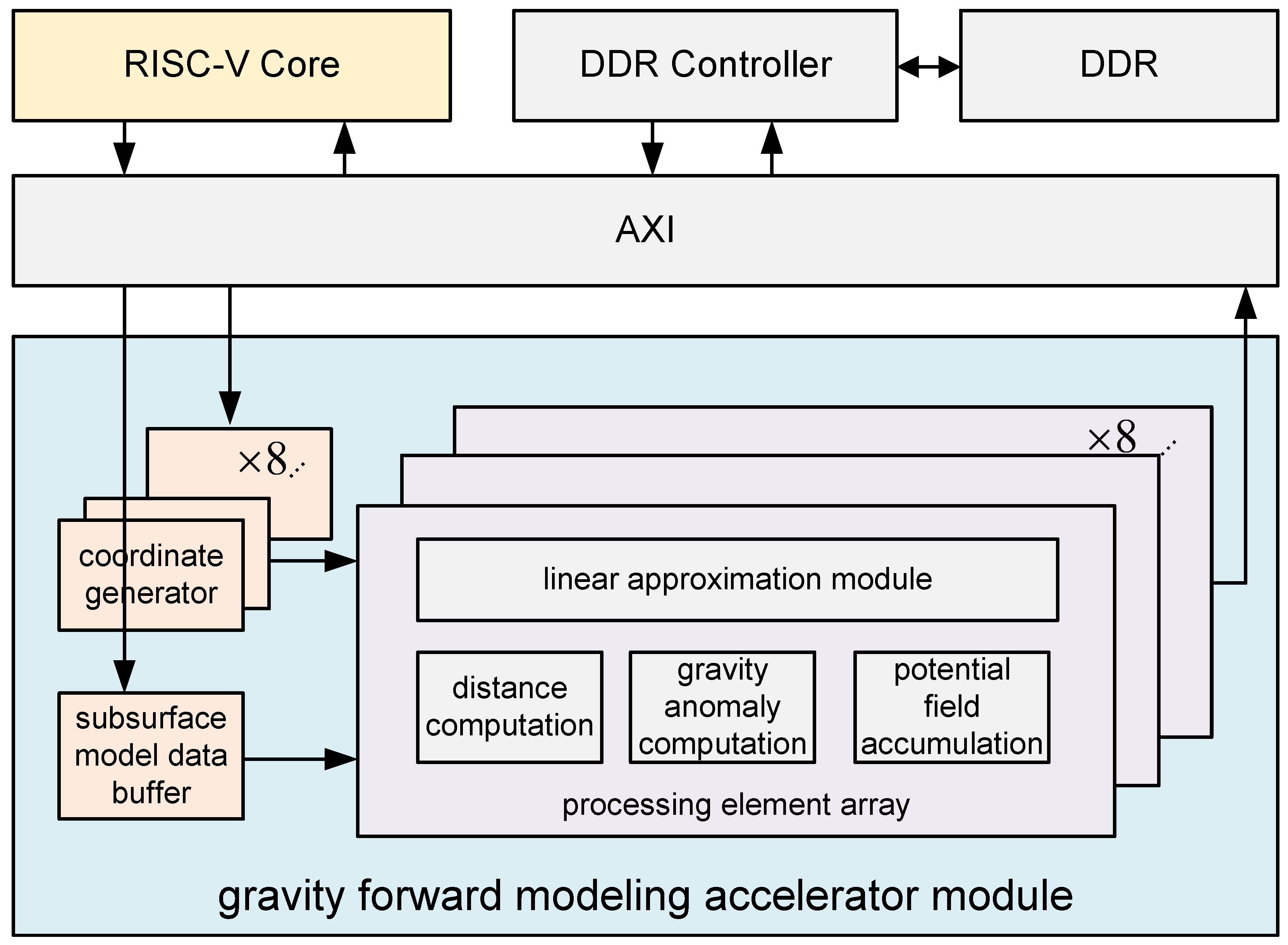 - We propose a custom instruction set extension for a RISC-V CPU to support an FPGA-based gravity forward modeling accelerator. To the best of our knowledge, this is the first FPGA-based accelerator design specifically targeting gravity forward modeling.