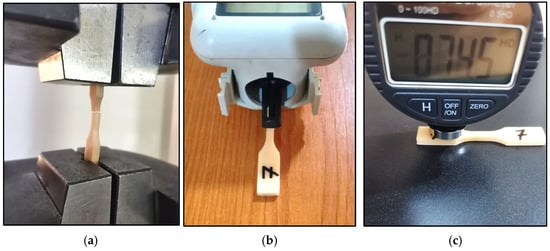 Testing of the samples: (a) tensile test, (b) surface roughness, (c) Shor-D hardness test.