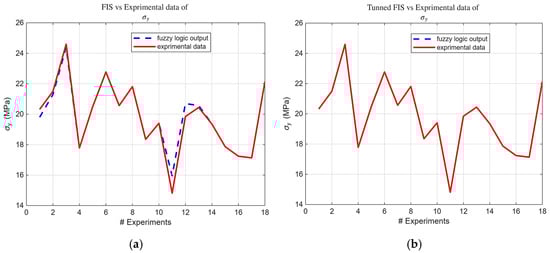 FIS output vs. experimental σy data; (a) before tuning; (b) after tuning.
