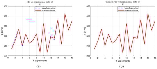 FIS output vs. experimental E data; (a) before tuning; (b) after tuning.