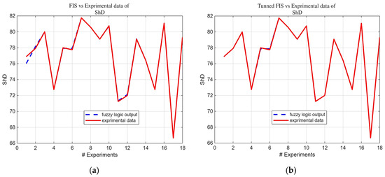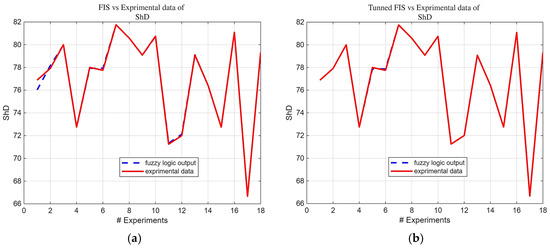 FIS output vs. experimental ShD data; (a) before tuning; (b) after tuning.