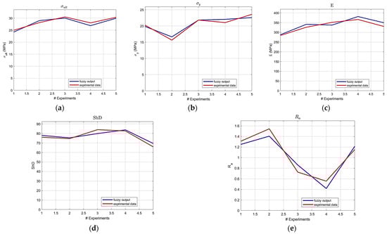 Experimental values vs. prediction outcomes: (a) ultimate tensile strength, (b) yield strength, (c) Young’s modulus, (d) Shore D hardness, (e) surface roughness.