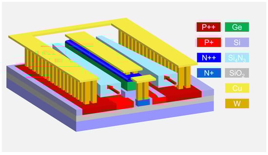 Figure 1 illustrates the three-dimensional (3D) schematic of the proposed APD. A lateral coupling scheme via a Si3N4 waveguide is employed to efficiently couple the evanescent field into the Ge absorption region. The incident direction of the optical field is indicated by the red arrow. Compared to Si waveguides, Si3N4 waveguides offer four notable advantages [28,29]: (1) they can tolerate higher input optical power, thereby reducing the risk of waveguide damage under high-power input; (2) they exhibit lower propagation loss and smaller polarization-dependent loss, which helps mitigate the polarization sensitivity of the device; (3) they readily enable lateral coupling, allowing light to be coupled simultaneously from both sides into the Ge absorption region, thereby achieving a more uniform optical field distribution; and (4) this design enables efficient integration with polarization-insensitive Si3N4-based WDMs without requiring additional converters, such as vias from Si to Si3N4 waveguides.