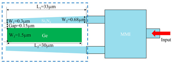 The operating principle of the APD is illustrated in Figure 2. The optical signal is guided through the Si3N4 waveguide to a conventional 1 × 2 Si3N4 multi-mode interference (MMI), where it is split and subsequently absorbed by the Ge layer to generate photocarriers. Optical simulations were performed using three-dimensional finite-difference time-domain (3D-FDTD) methods, and the device parameters were designed with reference to the standard 130 nm SOI SiPh platform. After optimizing device performance, the determined optical structure parameters are W1 = 0.3 µm, W2 = 0.68 µm, L1 = 33 µm, Gap = 0.15 µm, L2 = 30 µm, and W3 = 1.5 µm.