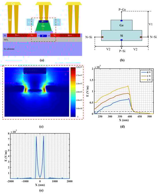 After completing the optical field design of the APD, the doping profile was further optimized. The overall 3D device structure is shown in Figure 1. A P+ doping layer is introduced in the Si waveguide beneath the Ge absorption layer, with an additional third electrode connected to the P+ region to control the avalanche electric field. The cross-sectional view of the device doping profile is illustrated in Figure 3a, where heavy doping is applied at metal-contact regions to reduce resistance. The doping concentrations are N++ (1.0 × 1020 cm−3), N+ (1.0 × 1019 cm−3), P++ (7.1 × 1019 cm−3), and P+ (5.3 × 1018 cm−3), respectively.