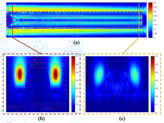 First, the optical field distribution of the APD at a wavelength of 1310 nm was simulated using FDTD. Figure 4a shows the top view of the optical field distribution, with the Ge region indicated by the red dashed box. In this APD coupling design, light is coupled from both sides, producing a uniform electric field distribution in the Ge region and thereby enhancing photodetection efficiency. Figure 4b,c present the cross-sectional optical field distributions at the input and output positions, respectively. The results indicate that the majority of the light in the Si3N4 waveguide is absorbed by Ge, with only a small fraction leaking outside the Ge region.