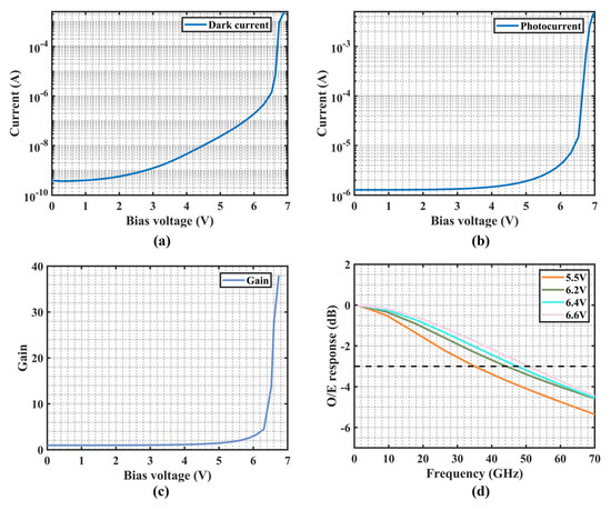 Figure 5d presents the small-signal simulation results, showing that the 3-dB OE bandwidth increases with reverse bias, reaching 51 GHz at 6.6 V. Under the same bias condition, the gain of the device is 27. Thus, the GBP, obtained as the product of gain and bandwidth, is 1377 GHz, confirming the excellent performance of the proposed APD and its suitability for high-speed data transmission.