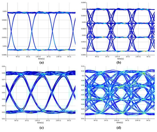 Figure 6. For the Si-Ge APD, eye diagrams for 100 Gbps NRZ signals. (a) Original optical signal eye diagram. (c) Eye diagram after detection, eye diagrams for 200 Gbps PAM4 signals. (b) Original optical signal eye diagram. (d) Eye diagram after detection.