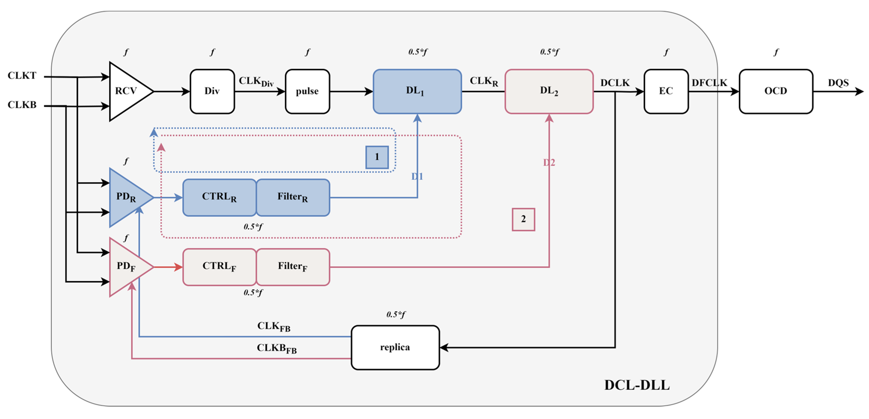 The proposed DCL-DLL architecture is specifically designed to achieve precise alignment between the rising edges of input clock (CLKT and CLKB) and output clock (DQS), while maintaining an exact 50% duty cycle for DQS (excluding OCD effects). Among them, T and B are only used as markers. Usually, we consider T to be the positive phase and B to be the negative phase. To accomplish this, the design incorporates a secondary control loop that ensures stable and accurate 50% duty cycle regulation for the DCLK clock. Compared to traditional DLL incorporating analog DCC, the DCL-DLL structure exhibits superior architectural simplicity. This streamlined design significantly reduces development effort for complex analog circuits, enhances system stability and reliability, and ensures uncompromised data transmission integrity. In contemporary applications demanding extreme data accuracy, this safeguard is indispensable for normal system operation and effective data utilization.