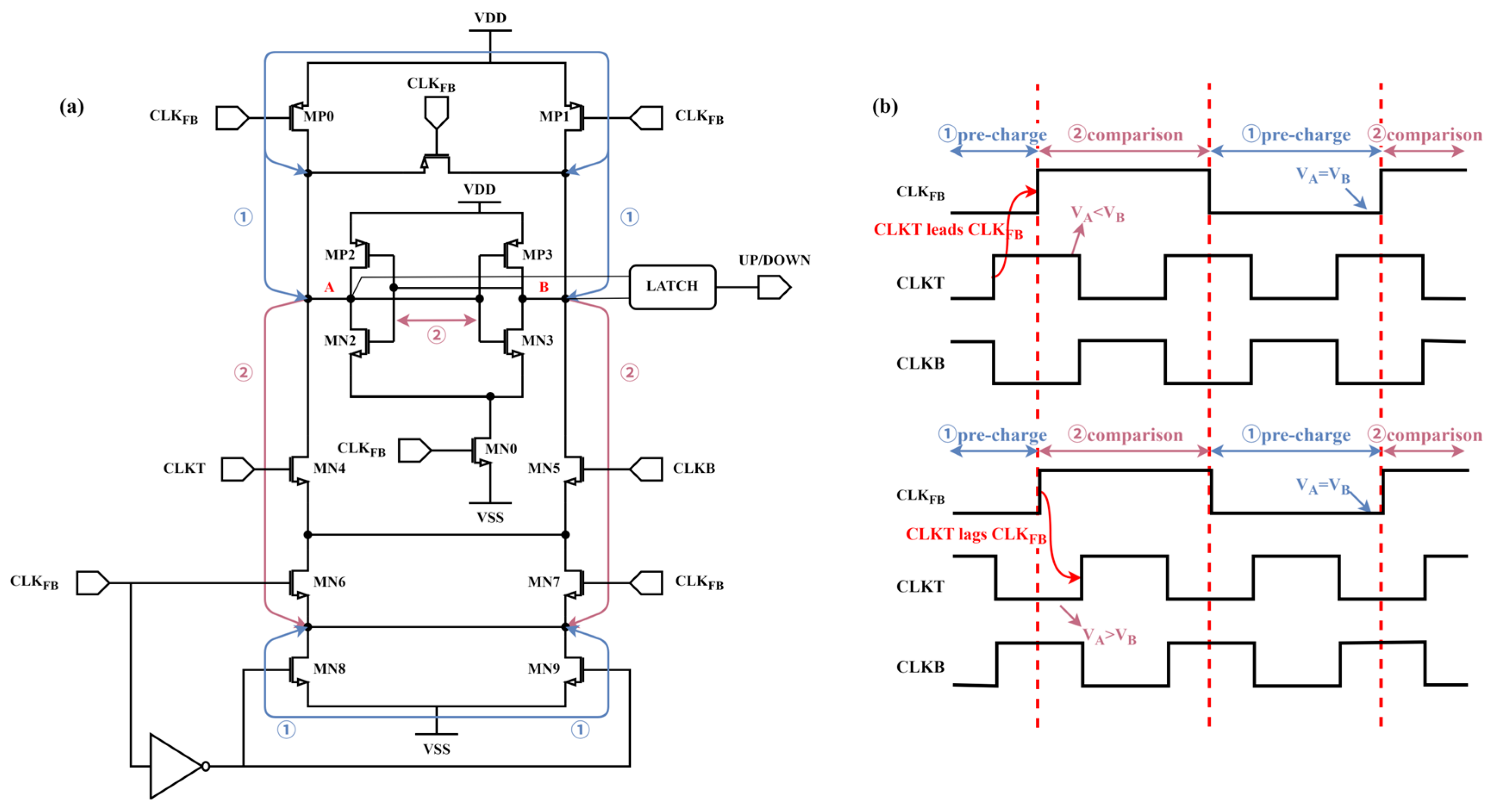 Figure 4a shows the block diagram of the Phase Detector. Due to the difficulty in replicating the delay of the RCV, the proposed DCL-DLL structure performs phase detection between CLKT and CLKFB, even though these two signals have different frequencies. Therefore, the BBPD used is frequency-insensitive and can function properly even with differing input clock frequencies. The BBPD phase detector operates in two states: the “pre-charge” state and the “comparison” state.