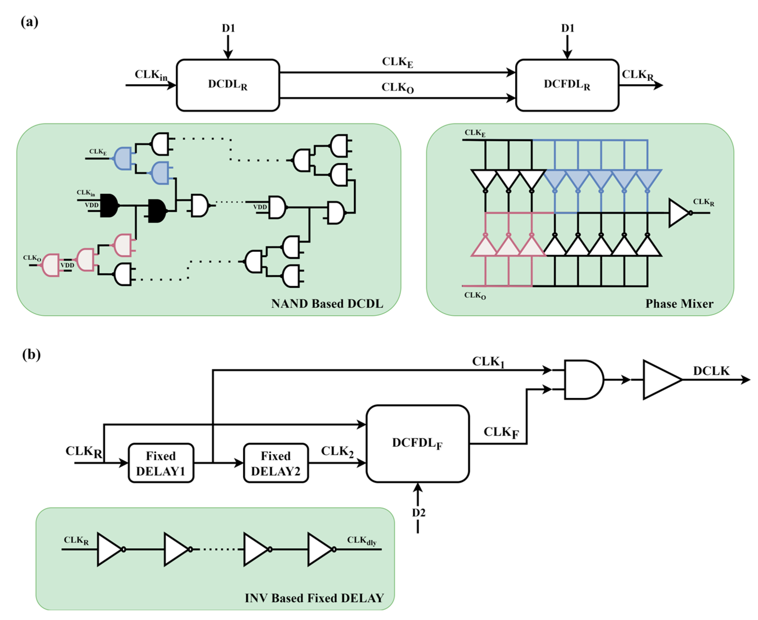 In Loop 1, the delay line DL1, as shown in Figure 5a, employs a combination of coarse and fine adjustment techniques to achieve high-precision clock signal adjustment. Specifically, the Digital control Coarse Delay Line (DCDLR) consists of multiple NAND delay cells. The number of NAND delay cells through which the clock signal (CLKin) passes is controlled by digital encoding, allowing for the initial delay adjustment of the clock signal. The delay generated by this process is N* 2 * Tdly, where Tdly is the delay of a single NAND gate, N is an integer and is controlled by the digital code D1. The adjusted clock signals, CLKE and CLKO, are then input into the Digital Control Fine Delay Line (DCFDLR). The fine adjustment module further adjusts the signal using digital encoding to perform interpolation, resulting in a highly accurate clock signal output, denoted as CLKR.