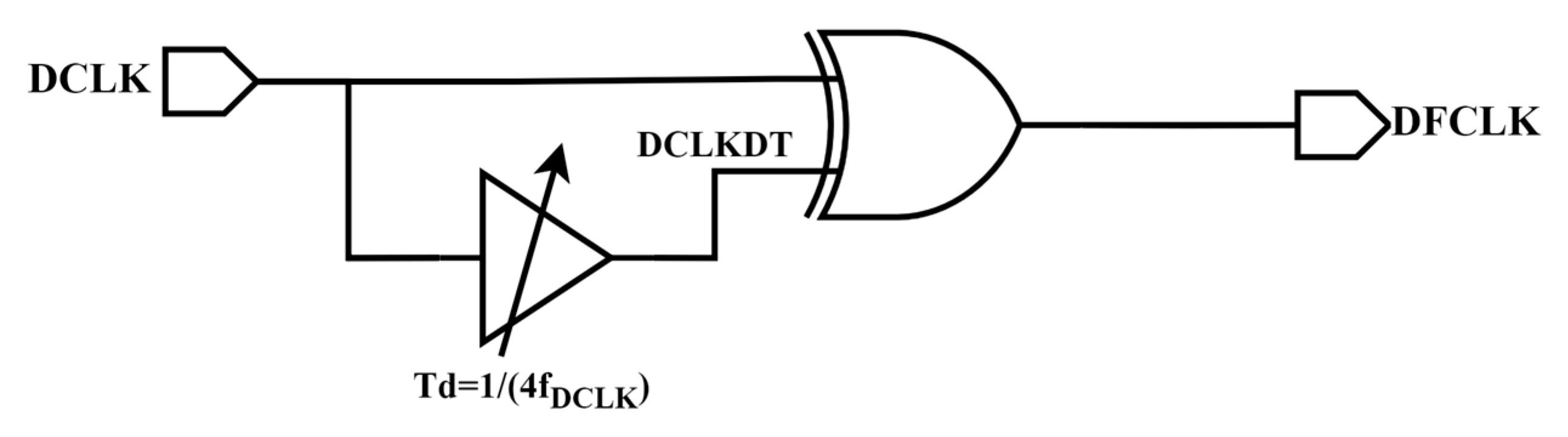 The edge combiner structure is shown in Figure 6, and this structure is a simple frequency multiplier. For the clock DCLK, delay it by 1/4 of a clock cycle to obtain the clock DCLKDT. Then, performing an exclusive OR operation between DCLK and DCLKDT, the frequency doubling function of the DCLK clock can be achieved.