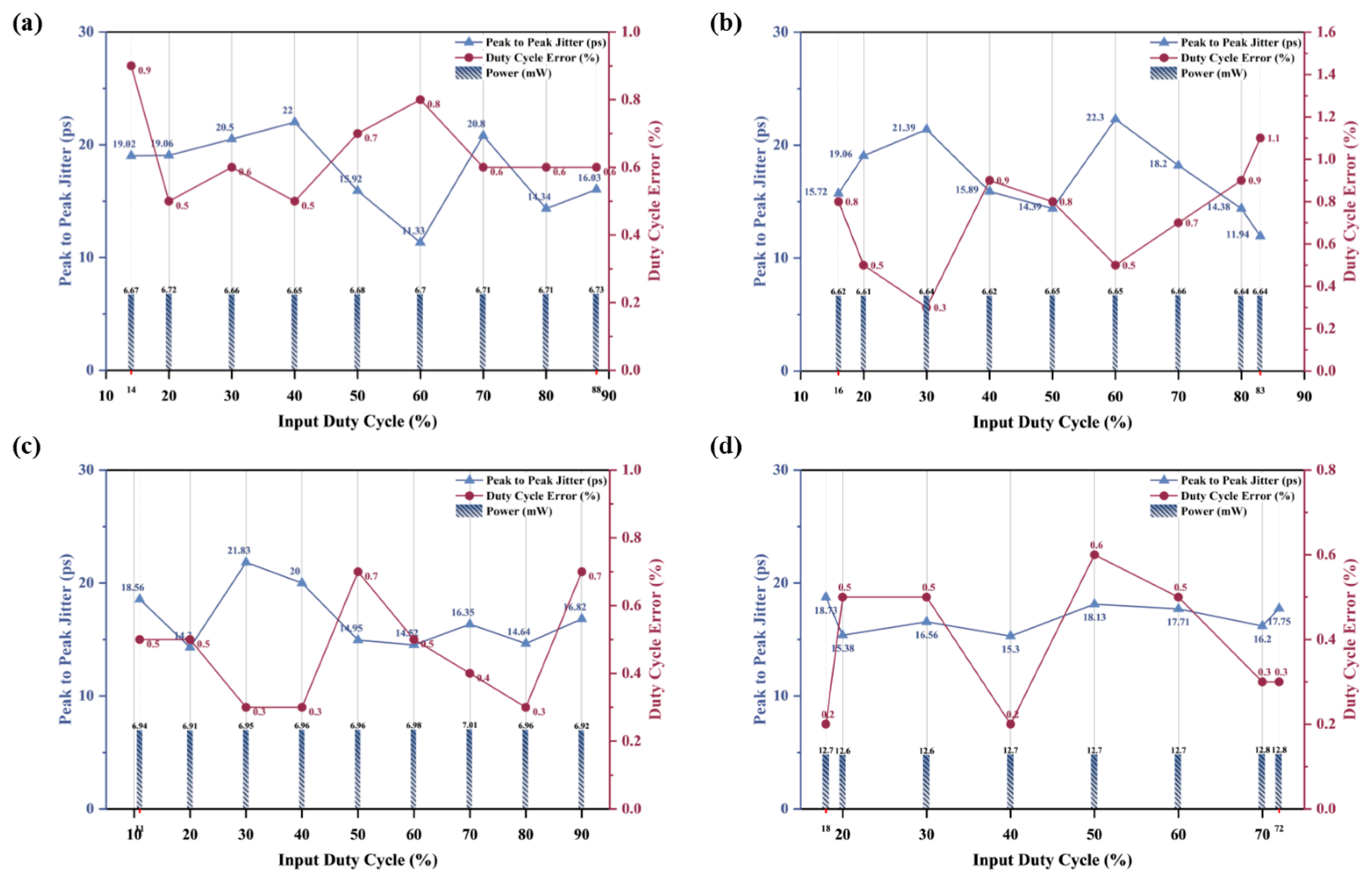 Figure 7. Simulation results for input clocks at 25 °C with different duty cycles: (a) 1.6 GHz, 25°, tt corner; (b) 1.6 GHz, 25°, ss corner; (c) 1.6 GHz, 25°, ff corner; (d) 3.2 GHz, 25°, tt corner.