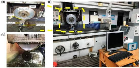 ELID grainless iron-based grinding wheel polishing equipment. (a) ELID sharpening system, (b) EDM shaping system, (c) overall of the ELID polishing setup.