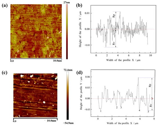AFM test results of glass substrate. (a) Grainless iron-based grinding wheel polishing glass substrate, A 10 μm × 10 μm area with a resolution of 0.1−0.2 nm, Five replicate measurements, (b) Figure 2a Section profile analysis, (c) Polishing glass substrate with abrasive iron base grinding wheel, A 10 μm × 10 μm area with a resolution of 0.1−0.2 nm, Five replicate measurements, (d) Figure 2c Section profile analysis.