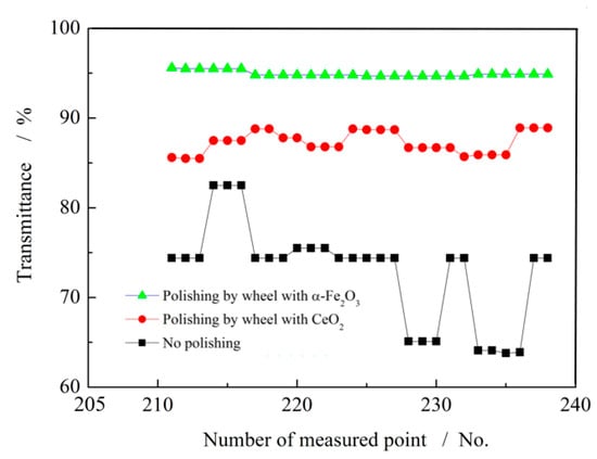 Optical transmittance directly affects the image quality and brightness of display screens, making it a critical performance index for glass substrates. The transmittance of glass substrates was measured before and after superfine polishing with the CeO2 grinding wheel and the grainless iron-based grinding wheel (W0), using a transmission meter. The results are presented in Figure 4.