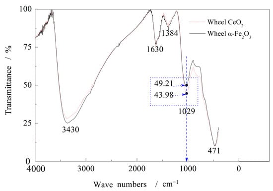 The infrared spectra of the two wheels are compared in Figure 7. The absorption band at 1029 cm−1 corresponds to the Fe–O vibration of α-Fe2O3, confirming its presence in both oxide films. However, the stronger intensity observed for W0 demonstrates a higher α-Fe2O3 content relative to W1.