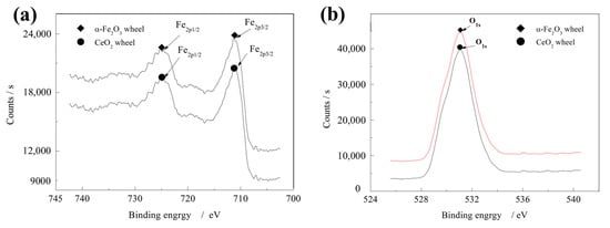 XPS test of wheel oxide film. (a) Fe3+ content XPS test, (b) XPS test of O element content.