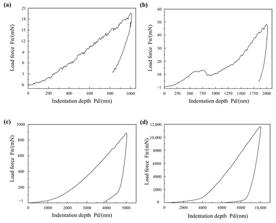 Load displacement curve. (a) Indentation 0.001 mm load displacement curve, (b) Indentation 0.002 mm load displacement curve, (c) Indentation 0.005 mm load displacement curve, (d) Indentation 0.01 mm load displacement curve.