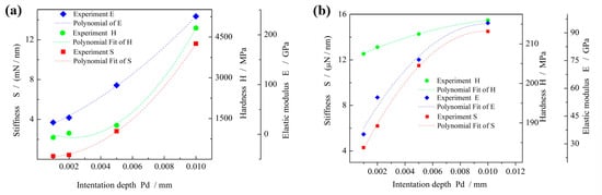 The derived mechanical properties are shown in Figure 10a. Hardness (H), elastic modulus (E), and stiffness (S) all increase with indentation depth. Specifically, hardness increases from 800 to 4900 MPa, elastic modulus from 23 to 230 GPa, and stiffness from 0.3 to 11 mN/nm. At shallow depths, the measured values primarily reflect the properties of the oxide film, where the matrix influence is minimal. With increasing indentation depth, the contribution of the grinding wheel substrate becomes more significant, resulting in higher measured values. At the maximum indentation depth of 0.01 mm, the measured hardness, elastic modulus, and stiffness approach those of the grinding wheel substrate.