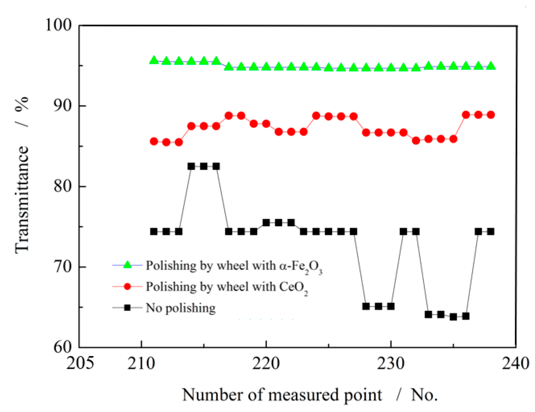 - Optical transmittance: After polishing with W0, glass substrates exhibited transmittance of 93–95%, approximately 5% higher than that obtained using CeO2 wheels. This improvement indicates superior potential for applications in display technologies, where enhanced image clarity and brightness are critical.
