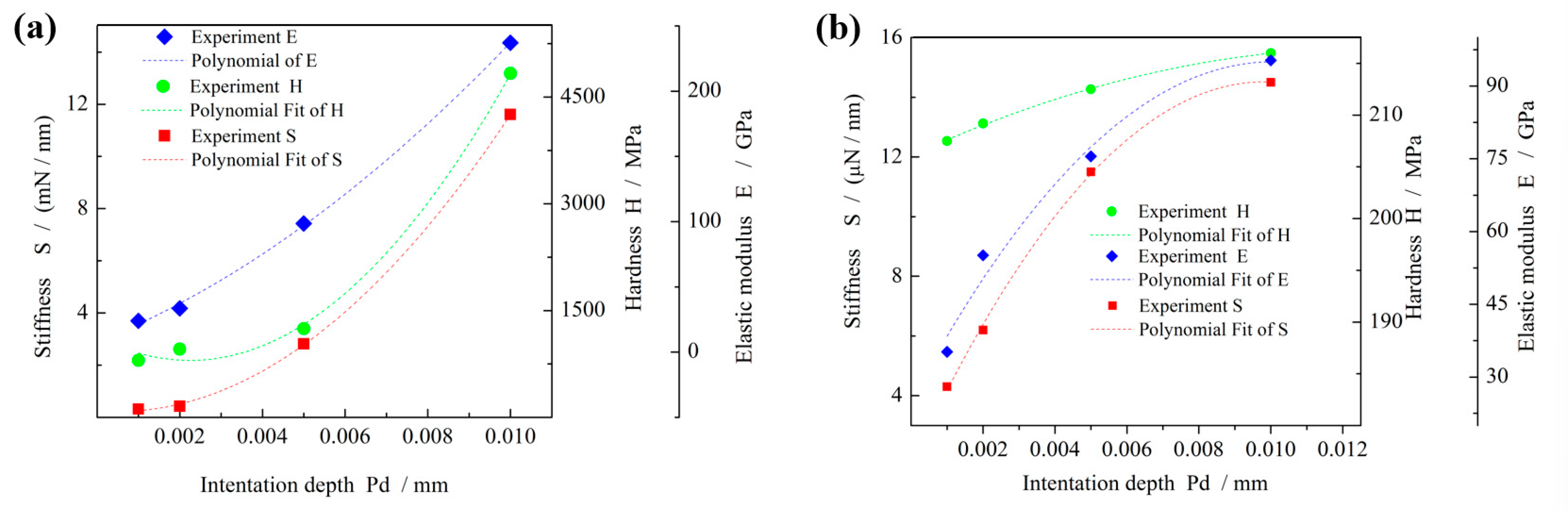 | Material | Hardness H (MPa) | Elastic Modulus E (GPa) | Stiffness S (mN/nm) |