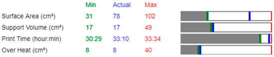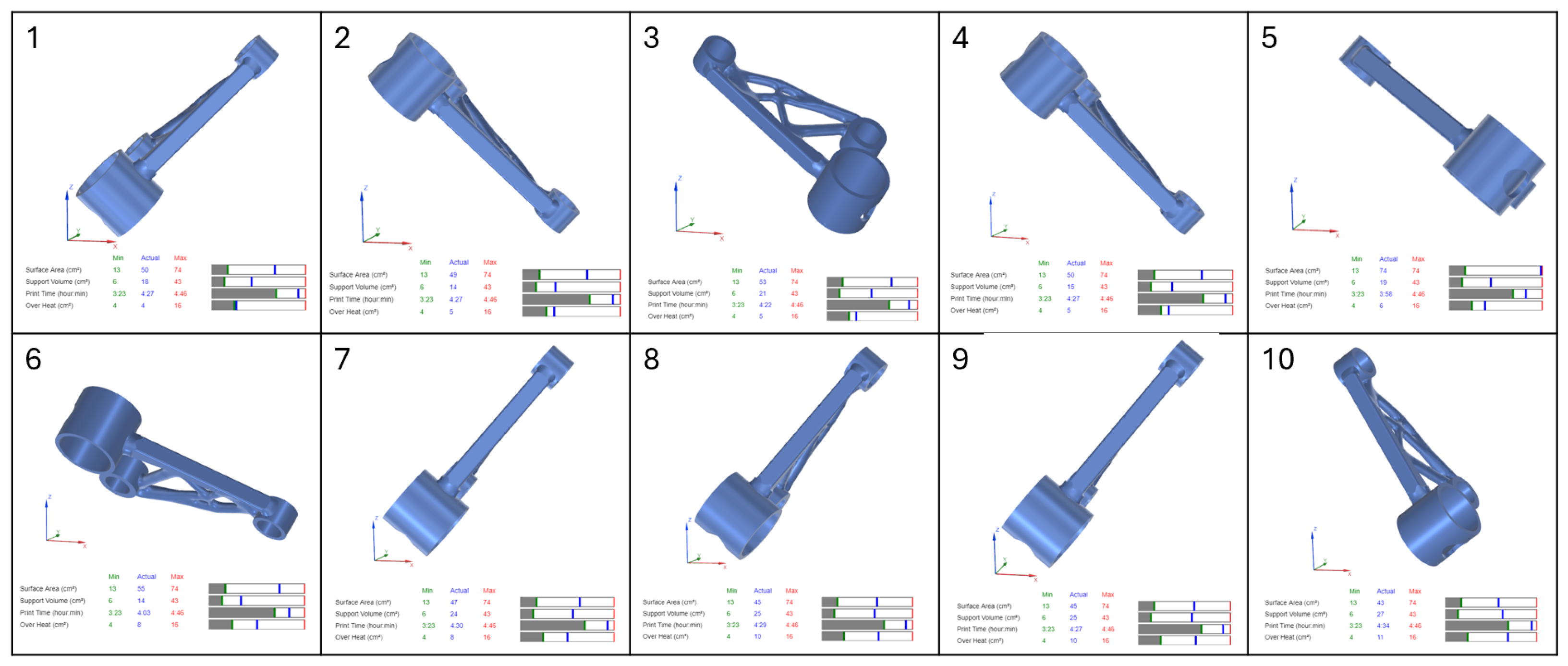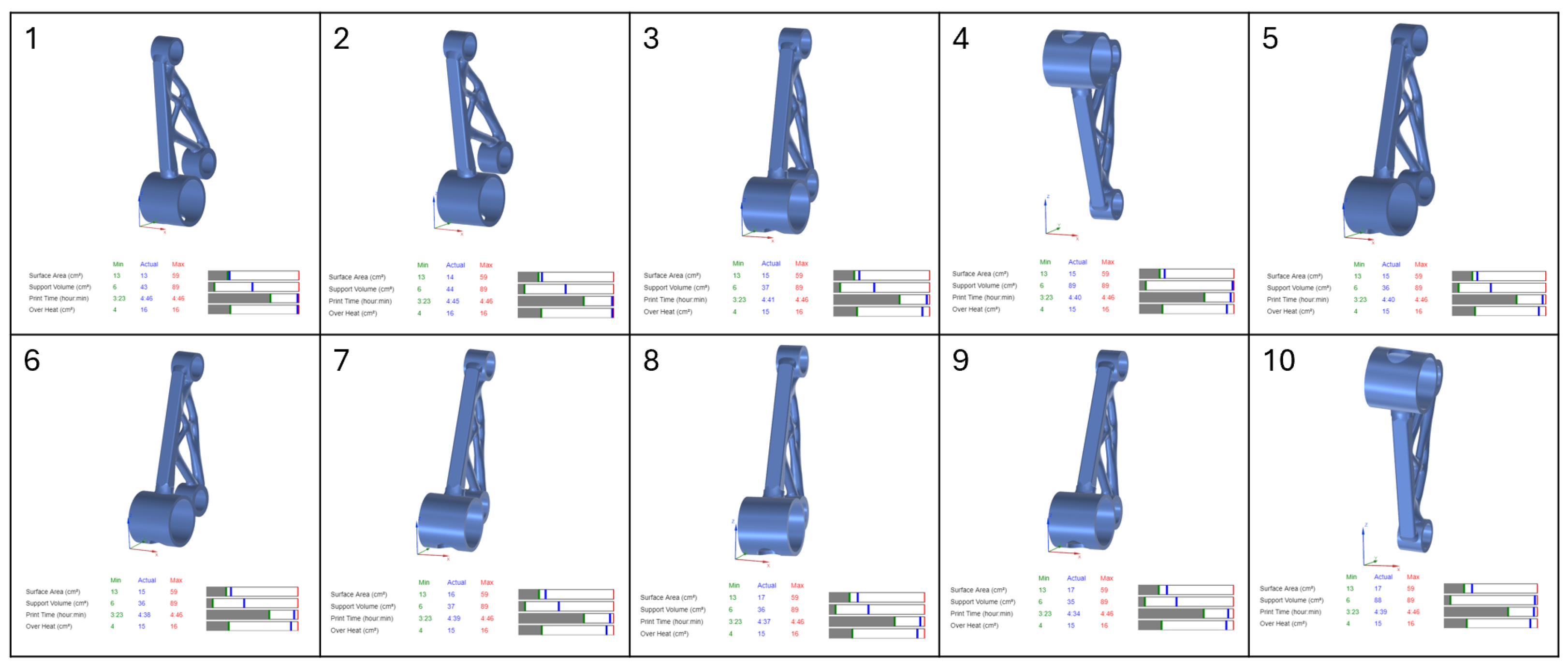 Figure 2). In this study, the selected orientations were analysed to ensure that the actual values were as close as possible to the minimum for each optimization parameter, thereby reducing material waste, minimising build time, and mitigating overheating risks. The results from this optimization were later compared with Atlas 3D outputs to validate the effectiveness of the orientation selection in minimising thermal distortions and improving overall printability.