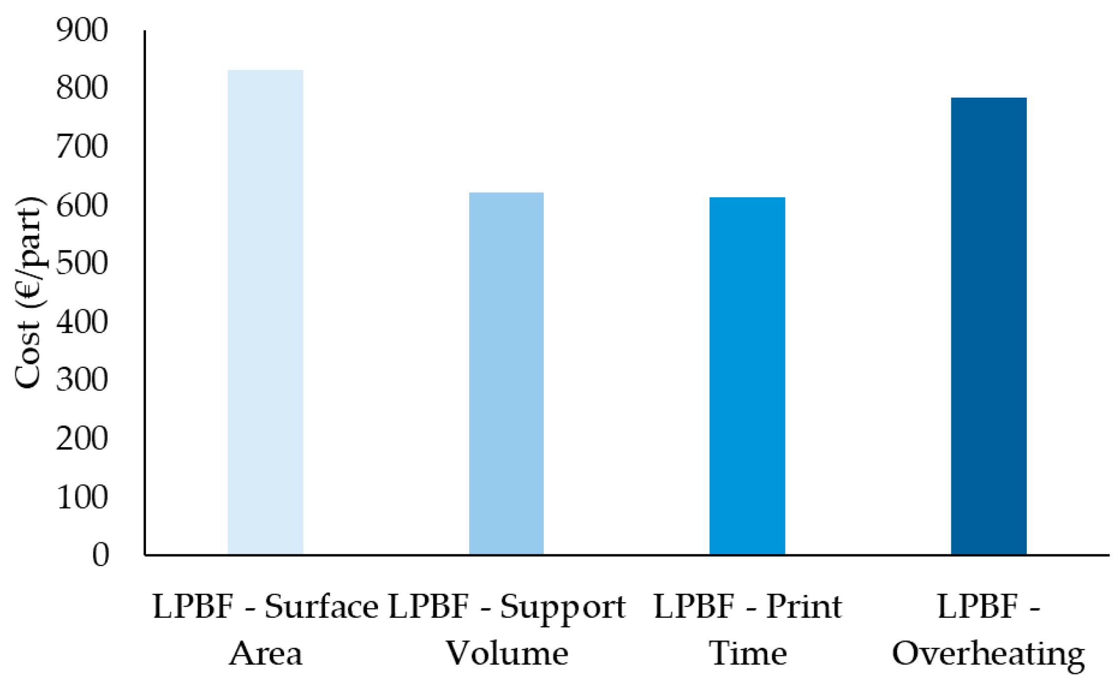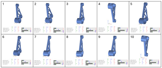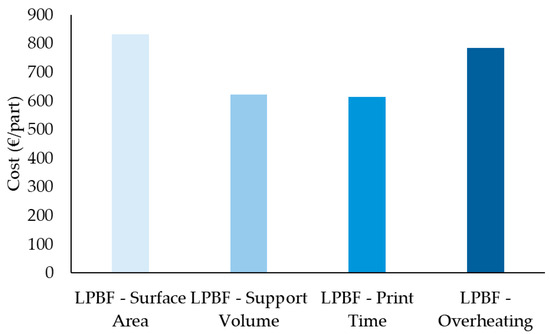 Table 5 reflect these trends. The surface area optimization was the most expensive (~€832.34/part), while support volume and print time strategies were the most cost-effective (both around €610–620/part). The cost per kilogram and per cm