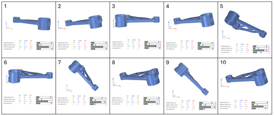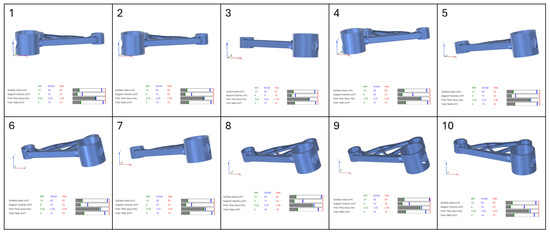 In this study, four separate part orientation optimizations were conducted, each prioritising one of the four parameters: surface area, support volume, print time, and overheating. For each optimization run, the weighting factor for the selected parameter was set to 100, while the remaining three parameters were assigned a weighting factor of 0. This ensured that each optimization exclusively focused on a single parameter at a time. Siemens NX provided a set of 10 possible orientations for each optimization run, ranked based on the chosen criterion. The first-ranked orientation from each optimization study was selected for further evaluation in the verification and validation stages of the workflow.