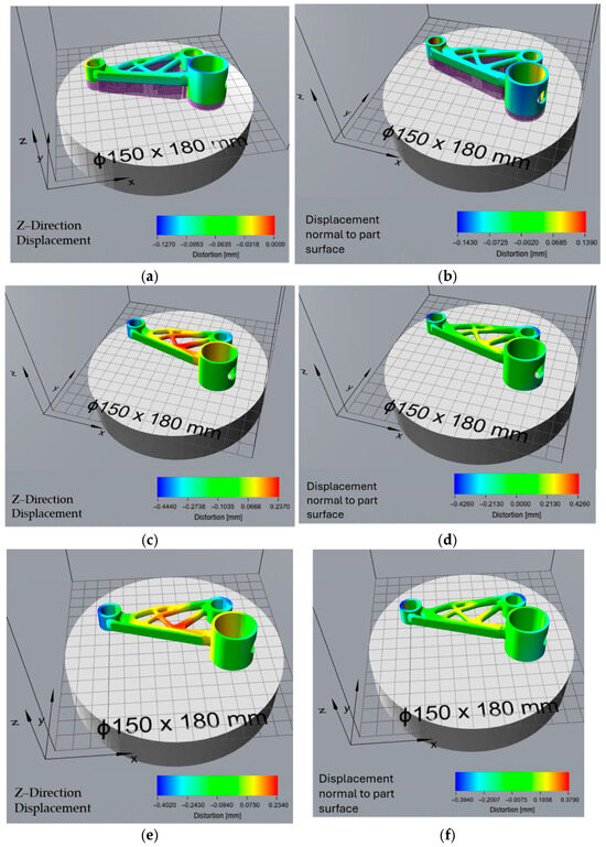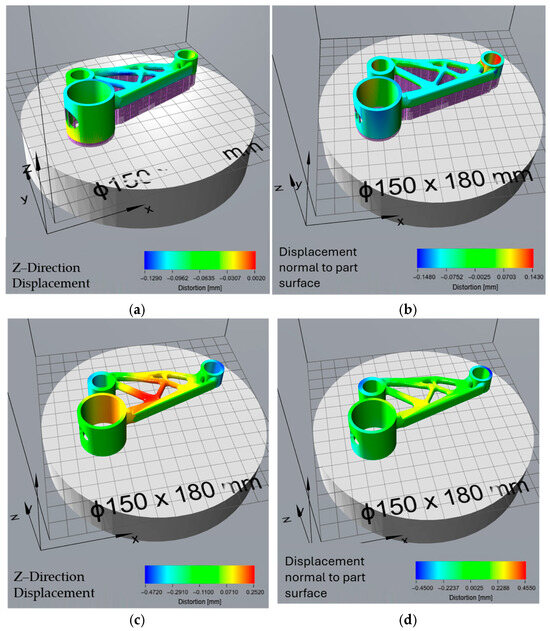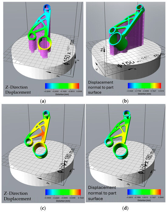 The print time optimization aimed to reduce manufacturing duration and exhibited similar low distortion values during the build process, with a Z-direction displacement of −0.129 mm to 0.002 mm. The displacement normal to the part surface also remained relatively controlled, within the range of −0.148 mm to 0.143 mm. However, this orientation suffered from the highest residual stress-induced deformation after support removal, with Z-direction displacement values reaching −0.472 mm. This indicates that while printing was efficient, significant residual stresses accumulated due to the rapid thermal cycles and material solidification patterns. The total distortion values, ranging from −0.438 mm to 0.243 mm, were among the highest, suggesting that while reducing print time is beneficial for efficiency, it introduces substantial geometric deviations that may require extensive post-processing. Similarly, Zhang et al. reported that while minimizing build time improves productivity, it often leads to thermal instability and increased distortion risk, particularly for geometrically complex parts [